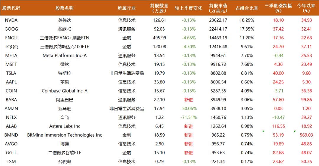 在三季度,亚马逊和奈飞被大幅减持,退出了前十大重仓股,而其余个股与上季度相比变化不大。此外,东方港湾还新进了 Astera Labs 和博通这两只 AI 产业链标的,延续了但斌对 AI 领域的持续投入。